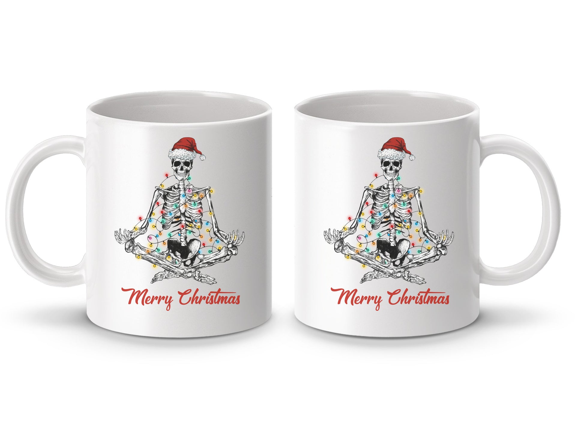 Meditating Skeleton with santa hat and Christmas Lights Mug